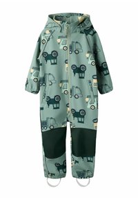 Blå vanntett overall med glidelås foran, med et lekent print av kjøretøy og trær. Elastiske mansjetter og avtakbare fotstropper inkludert.
