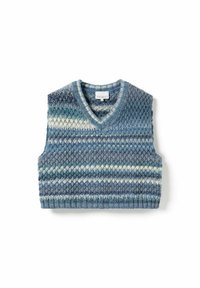 Strikket, ermeløs vest i forskjellige varme nyanser. Har en dyp V-hals, ribbestrikket kant, og et teksturert mønster med horisontale striper.