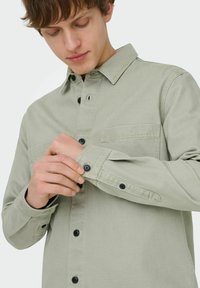 Ung mann iført lys grå skjorte med knappelukking og to brystlommer, svarte bukser, stående mot en ensfarget hvit bakgrunn.