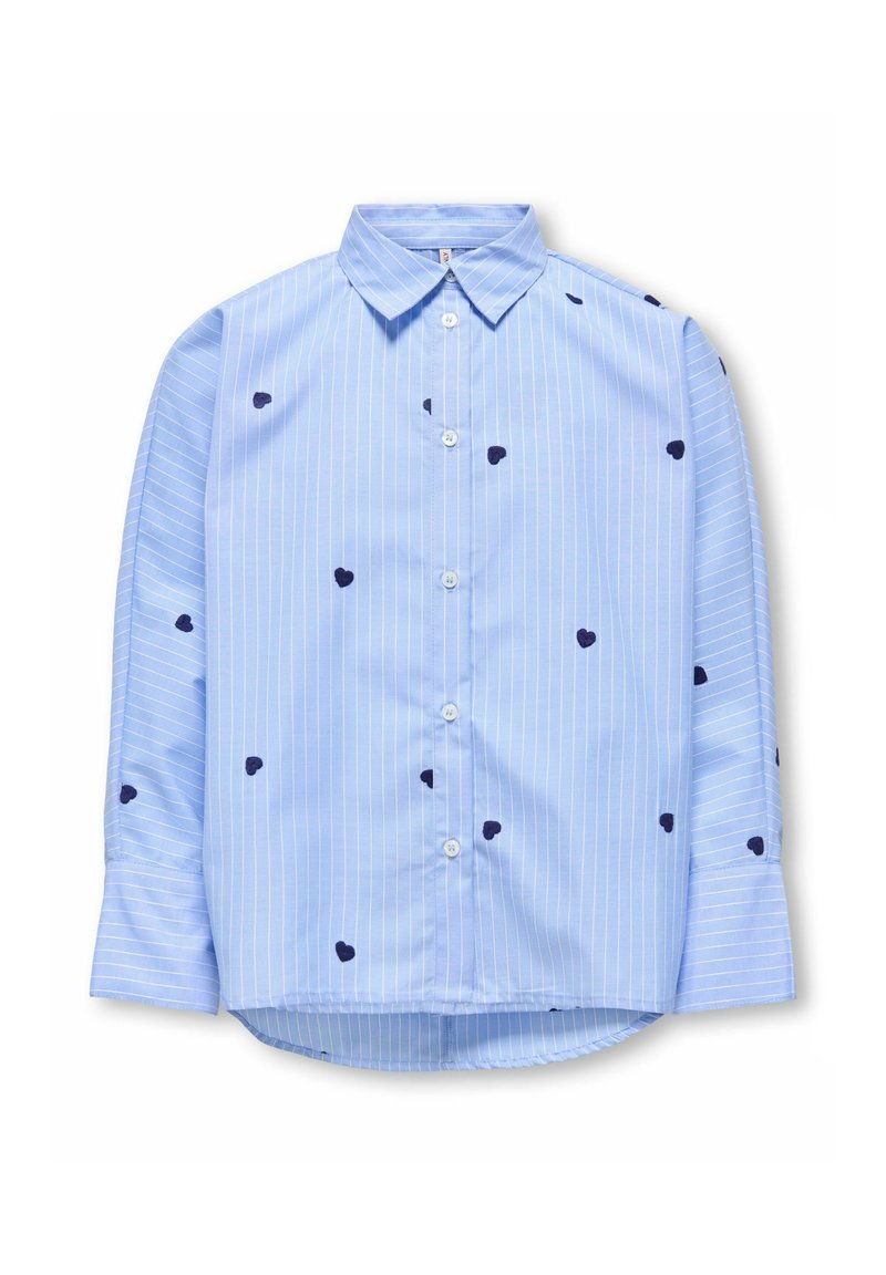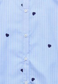 Lyseblå skjorte med hvite vertikale striper og spredte små marineblå hjerte-mønstre, lange ermer og spiss krage.