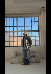 • Mann i uformelt antrekk med grå jakke, blå stripete skjorte, vide jeans, beige støvler og hvit caps står inne ved et stort vindu og en beige sofa.