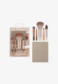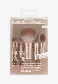 Real Techniques New Nudes 2.0 On-The-Glow Mini Makeup Brush Set + Mirrored Compact har alle touch-up-verktøyene du trenger – gjort portable. Denne limited-edition kolleksjonen er tilbake og bedre enn noen gang fordi nudes aldri går av moten. Makeup-børstesettet inkluderer 130 Mini Multitask Brush, 133 Mini Medium Shadow Brush, 132 Mini Smudge Brush, 134 Mini Definer Brush, 131 Mini Kitten Paw Brush og et BONUS kompaktspeil. Reise-makeup-børster fungerer med flytende, krem- og pudderprodukter som blush, konturering, bronzer, øyenskygge, liner, concealer og mer. De mini-størrelsene børstene og kompaktspeilet er perfekte å ta med på farten for raske touch-ups eller et helt look. Gi verktøyene dine den fornyelsen de fortjener med en kolleksjon som tør å vise alt. On-The-Glow Settet er lett å rengjøre ved å bruke vår Real Techniques Miracle Deep Cleansing Gel. Det er også 100% cruelty-free og vegansk.