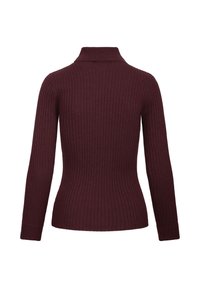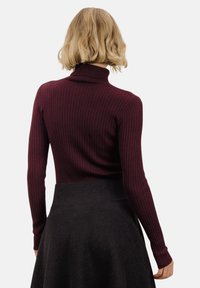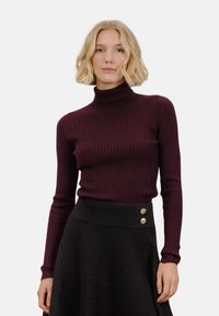 Burgunderfarget rillett genser med høy hals og lange ermer, kombinert med et svart skjørt med gullknapper i midjen.