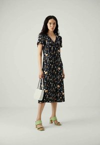 Svart blomstret kjole med korte ermer, V-hals, beltestedde midje og en flytende skjørt. Har oransje og hvite blomster mønstre. Kombinert med grønne hælsandaler.